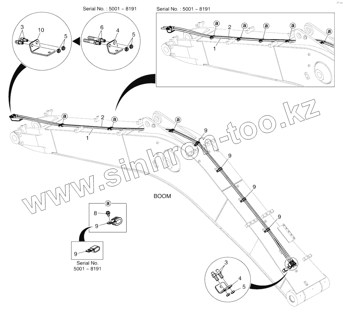 Каталог запасных частей к технике: Doosan DX140W. BOOM PIPING-QUICK CLAMP (BOOM-4.3M)