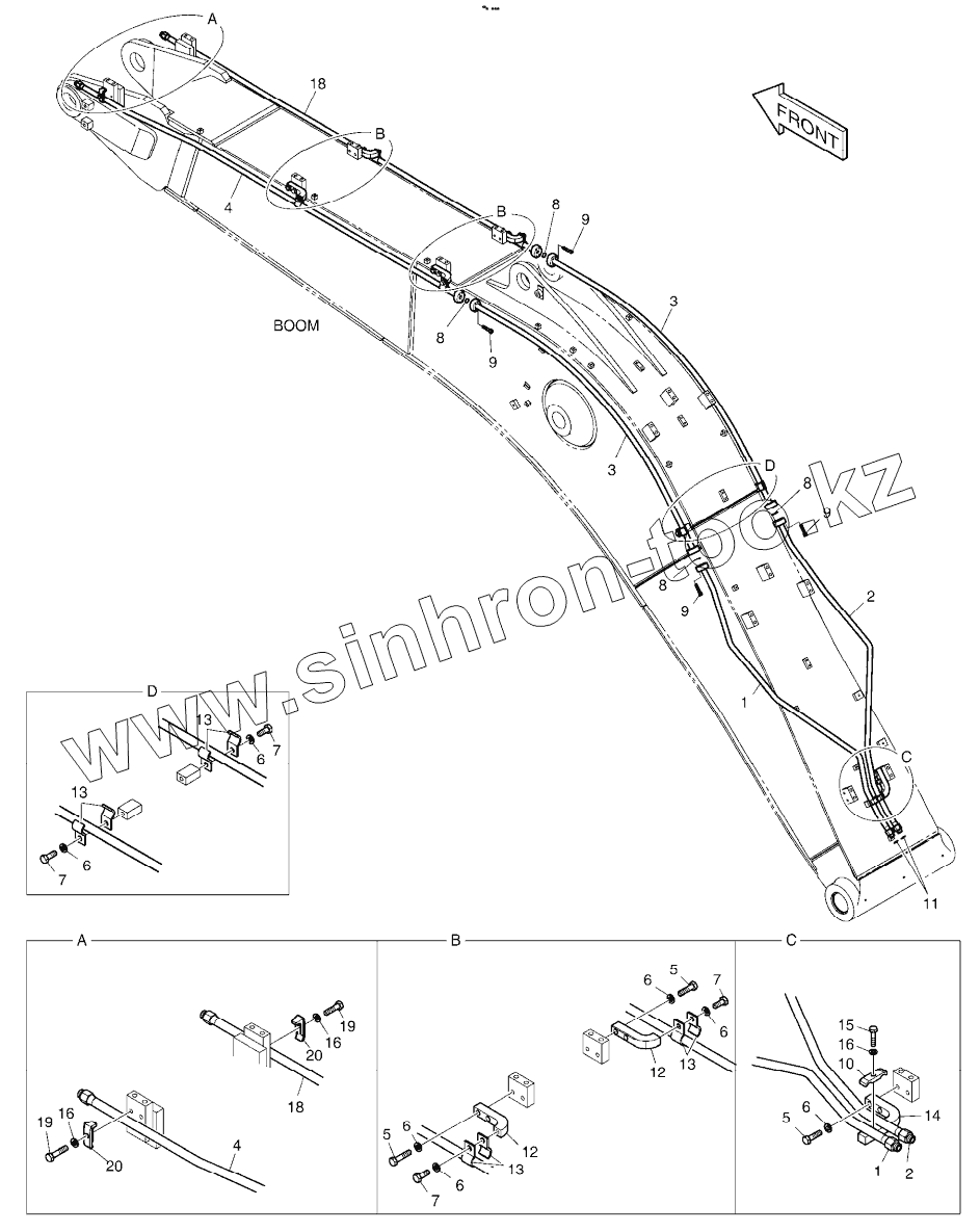 Каталог запасных частей к технике: Doosan DX225LCA. BOOM PIPING - BOOM 5.2m (ROTATING)