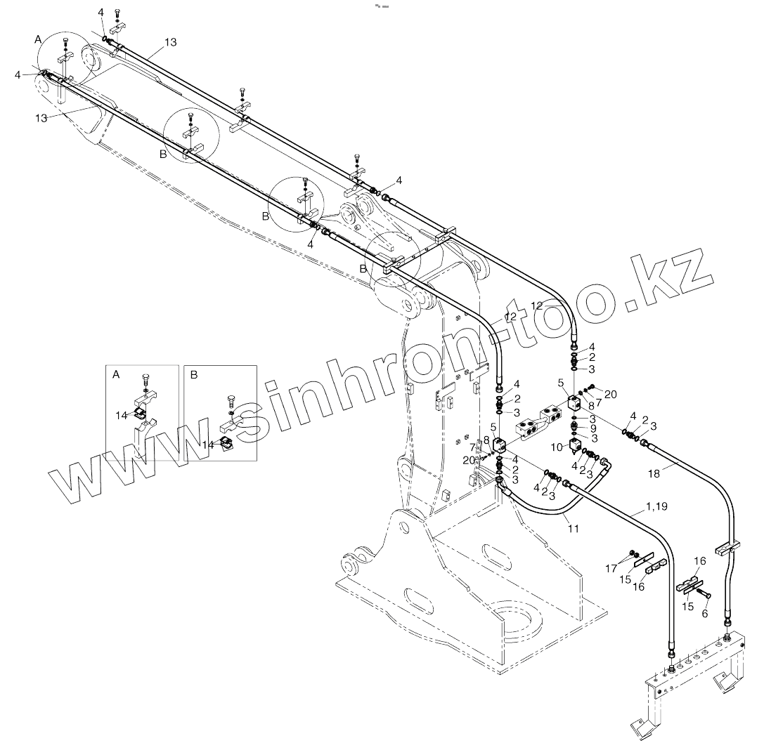 Каталог запасных частей к технике: Doosan SOLAR 160W-V. FRONT PIPING-ARTI. BOOM-1 WAY