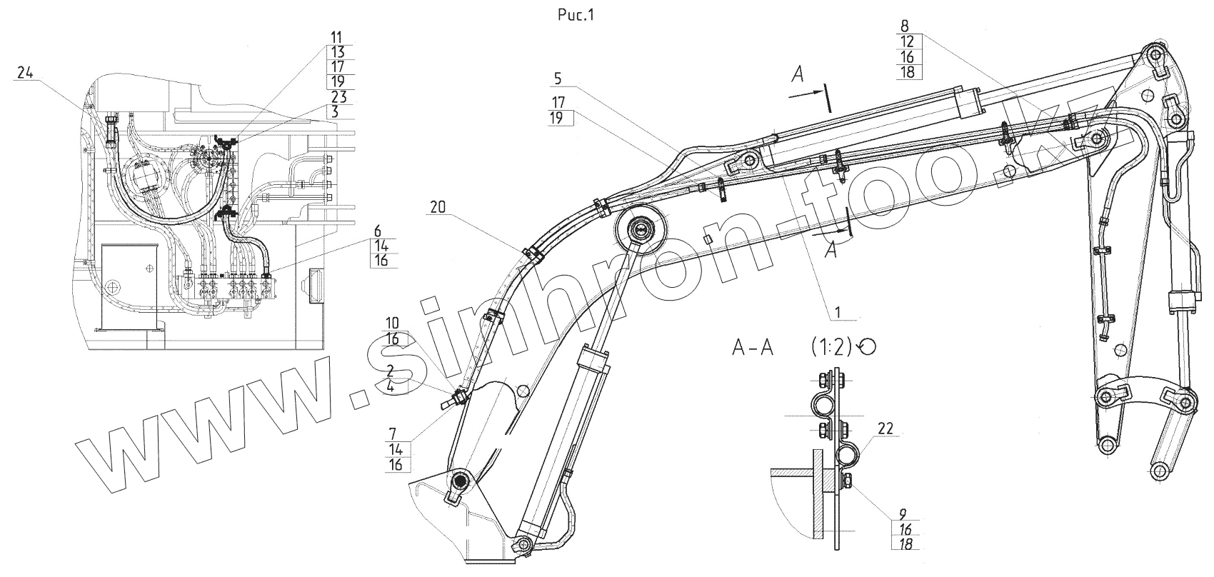 Каталог запасных частей к технике: ЭКСМАШ E170W. Трубопроводы гидромолота на рабочем оборудовании