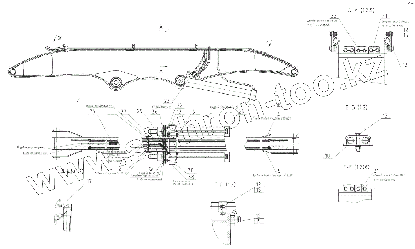 Каталог запасных частей к технике: ЭКСМАШ E230WH. Трубопроводы стрелы в сборе с гидроцилиндром
