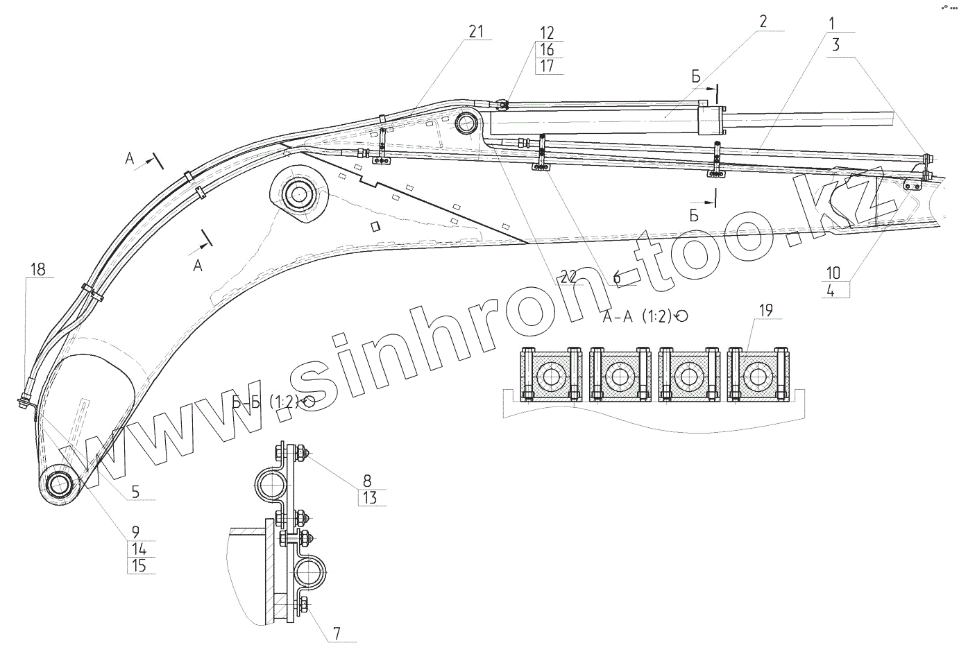 Каталог запасных частей к технике: ЭКСМАШ E240C. Трубопроводы стрелы в сборе с гидроцилиндром