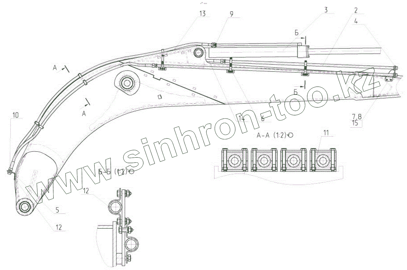 Каталог запасных частей к технике: ЭКСМАШ E300C. Трубопроводы стрелы в сборе с гидроцилиндром