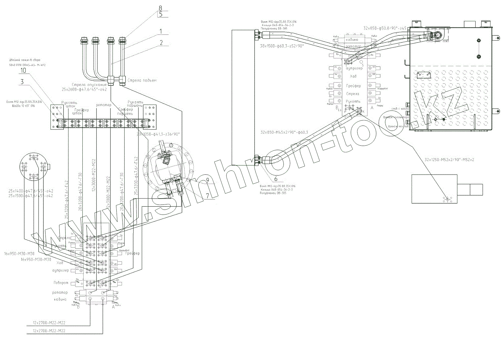 Гидрооборудование рукояти в сборе с трубопроводами
