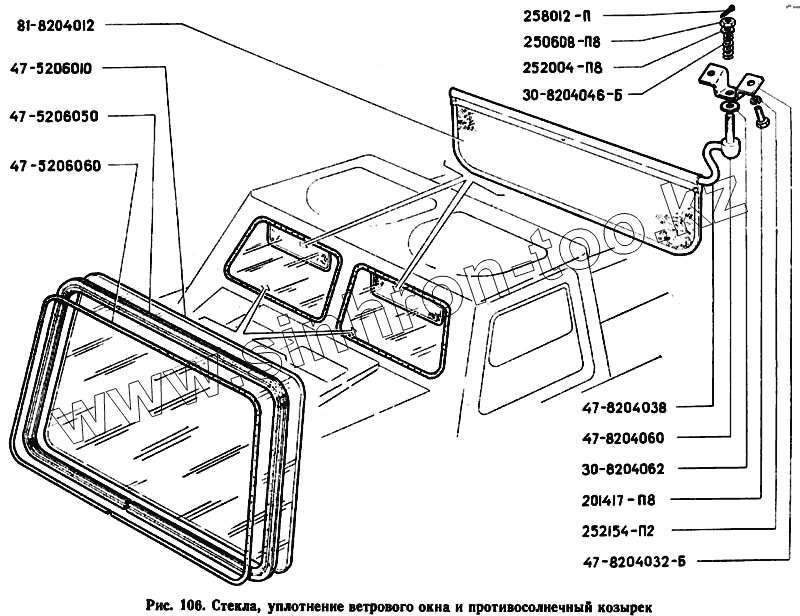 Каталог запасных частей к технике: ГАЗ-71. Стекла, уплотнение ветрового окна и противосолнечный козырек