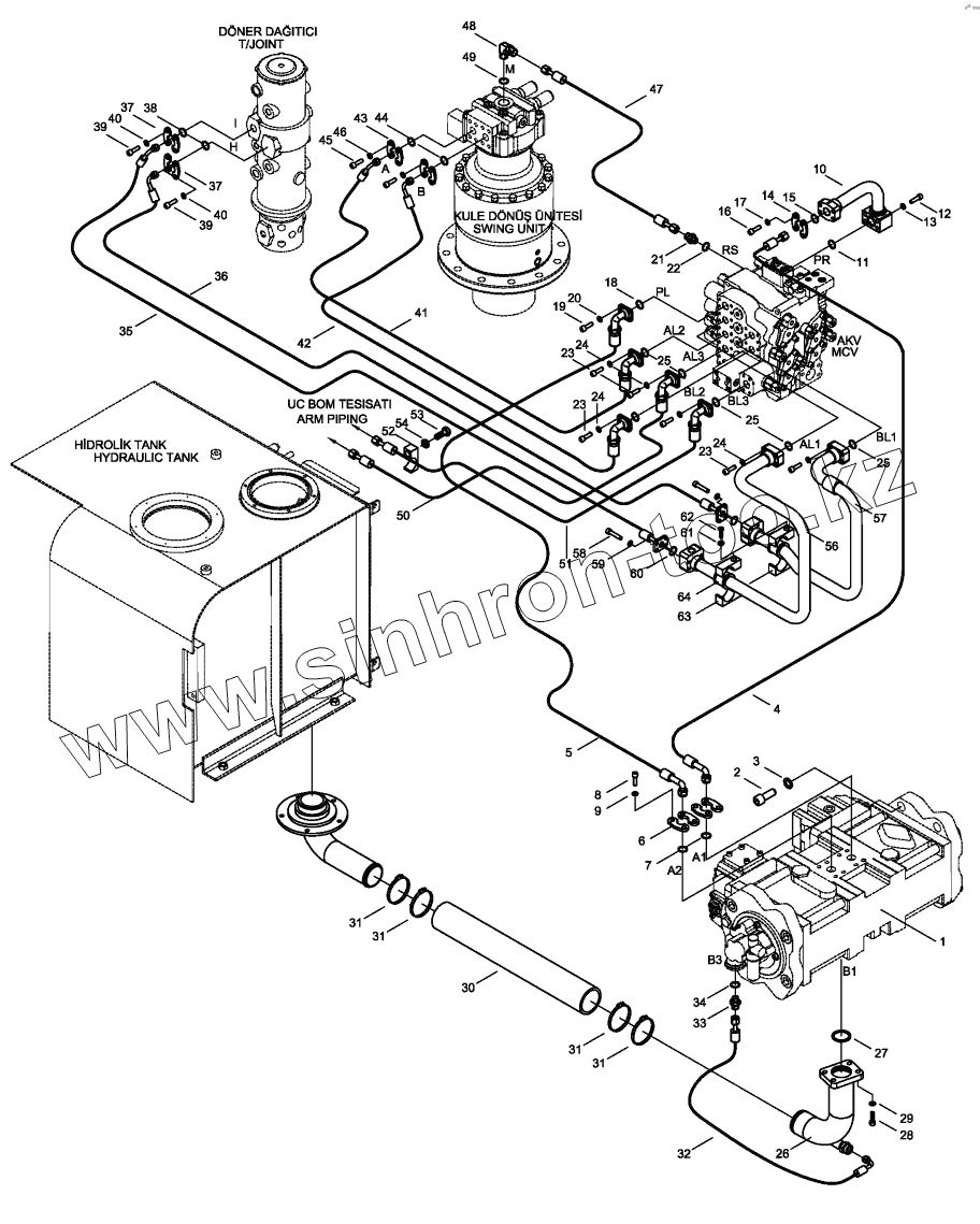 Каталог запасных частей к технике: Hidromek HMK 200W. MAIN PIPING MOUNTING L/H