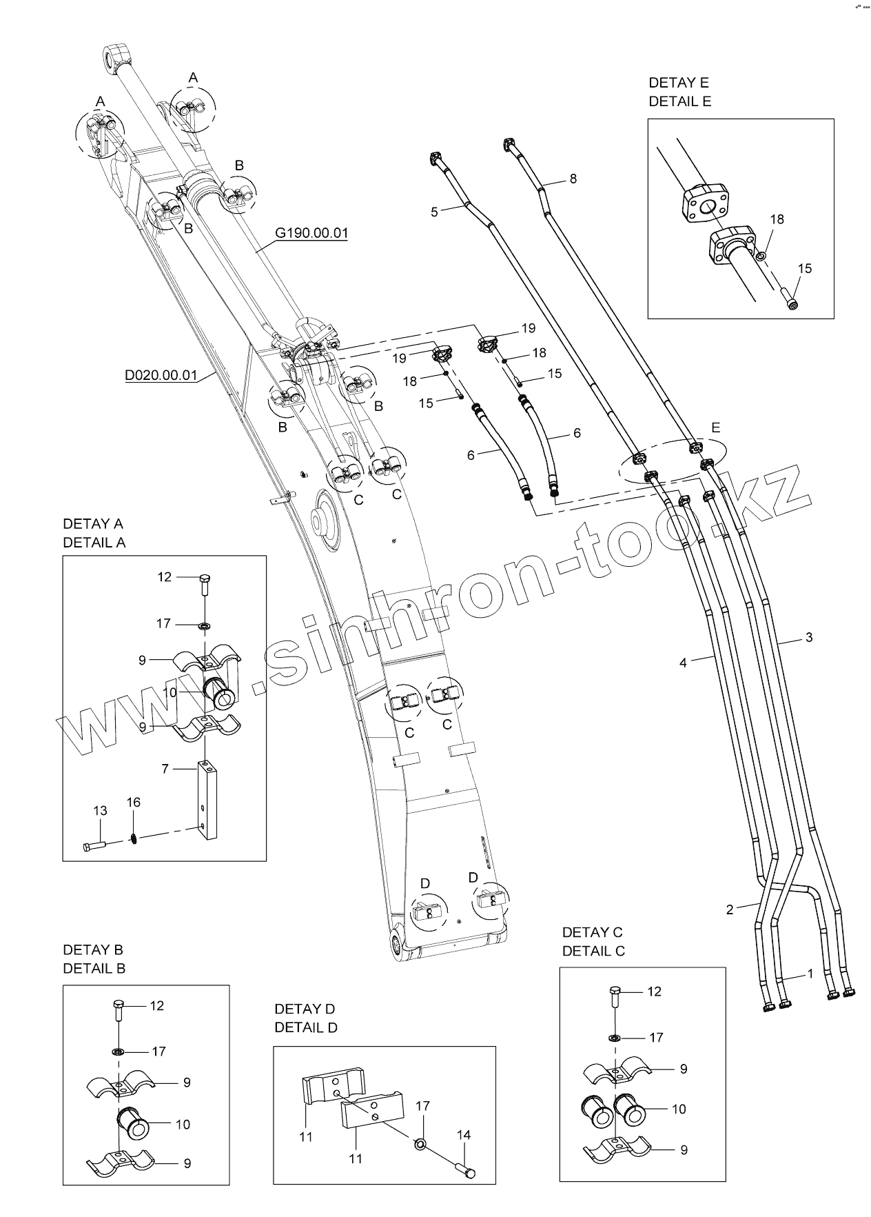 Каталог запасных частей к технике: Hidromek HMK 230LC3. ATTACHMENT HYD. PIPING, BOOM (5.7m)