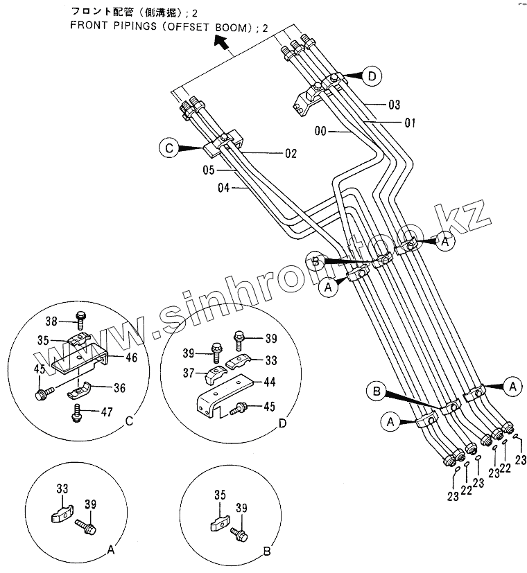 Каталог запасных частей к технике: Hitachi EX-100-2. FRONT PIPINGS (OFFSET BOOM): 1