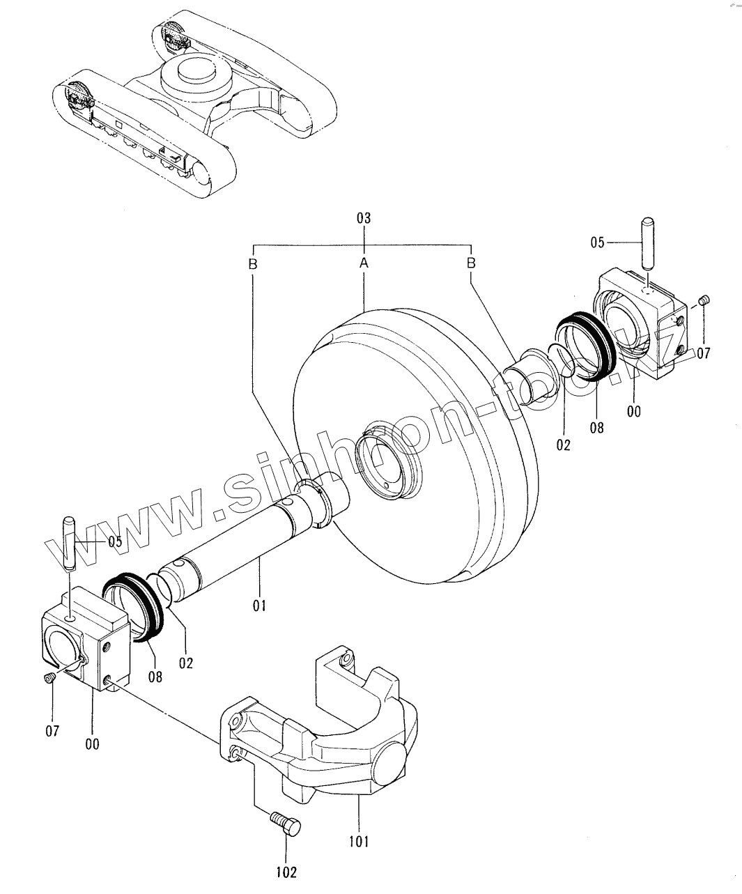 Каталог запасных частей к технике: Hitachi EX-100-3. FRONT IDLER (RUBBER CRAWLER)