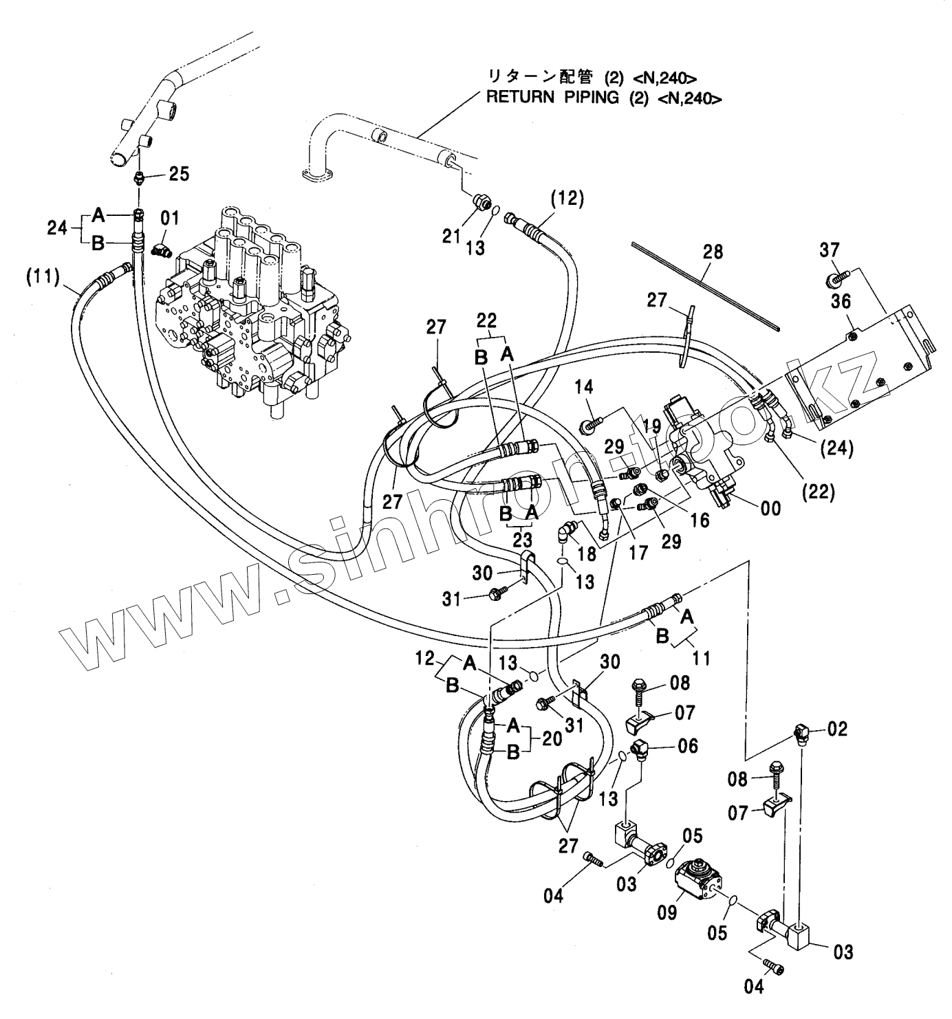 Каталог запасных частей к технике: Hitachi ZX-200. MAIN PIPING (PTO) (MONO BOOM) <N,240>