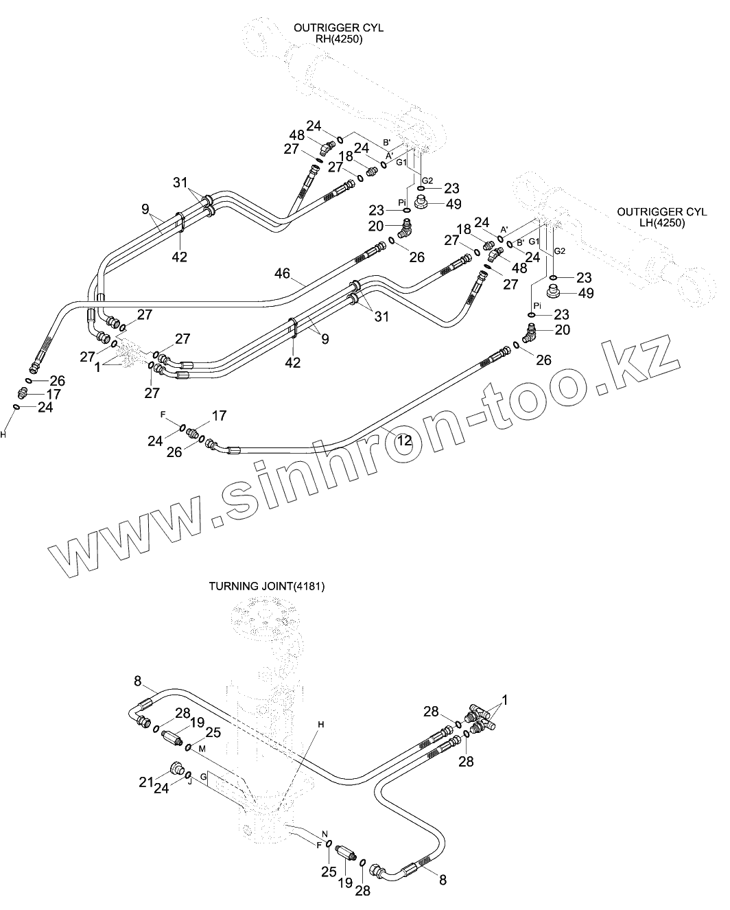 Каталог запасных частей к технике: Hyundai R140W-9. LOWER HYD PIPING (2 OUTRIGGER, #0310-)