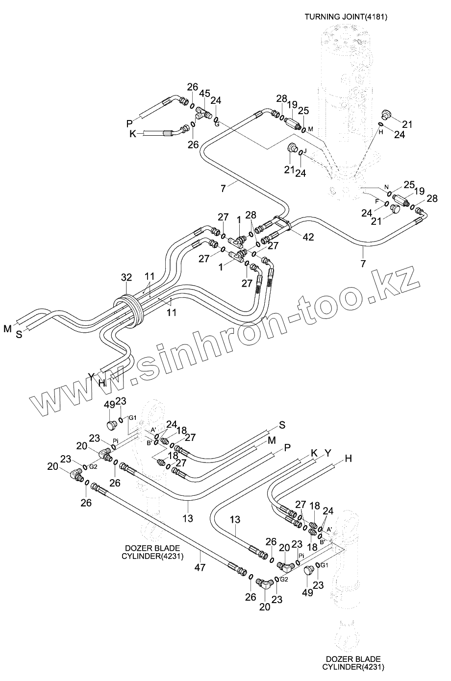 Каталог запасных частей к технике: Hyundai R140W-9. LOWER HYD PIPING (FRONT BLADE, #0310-)