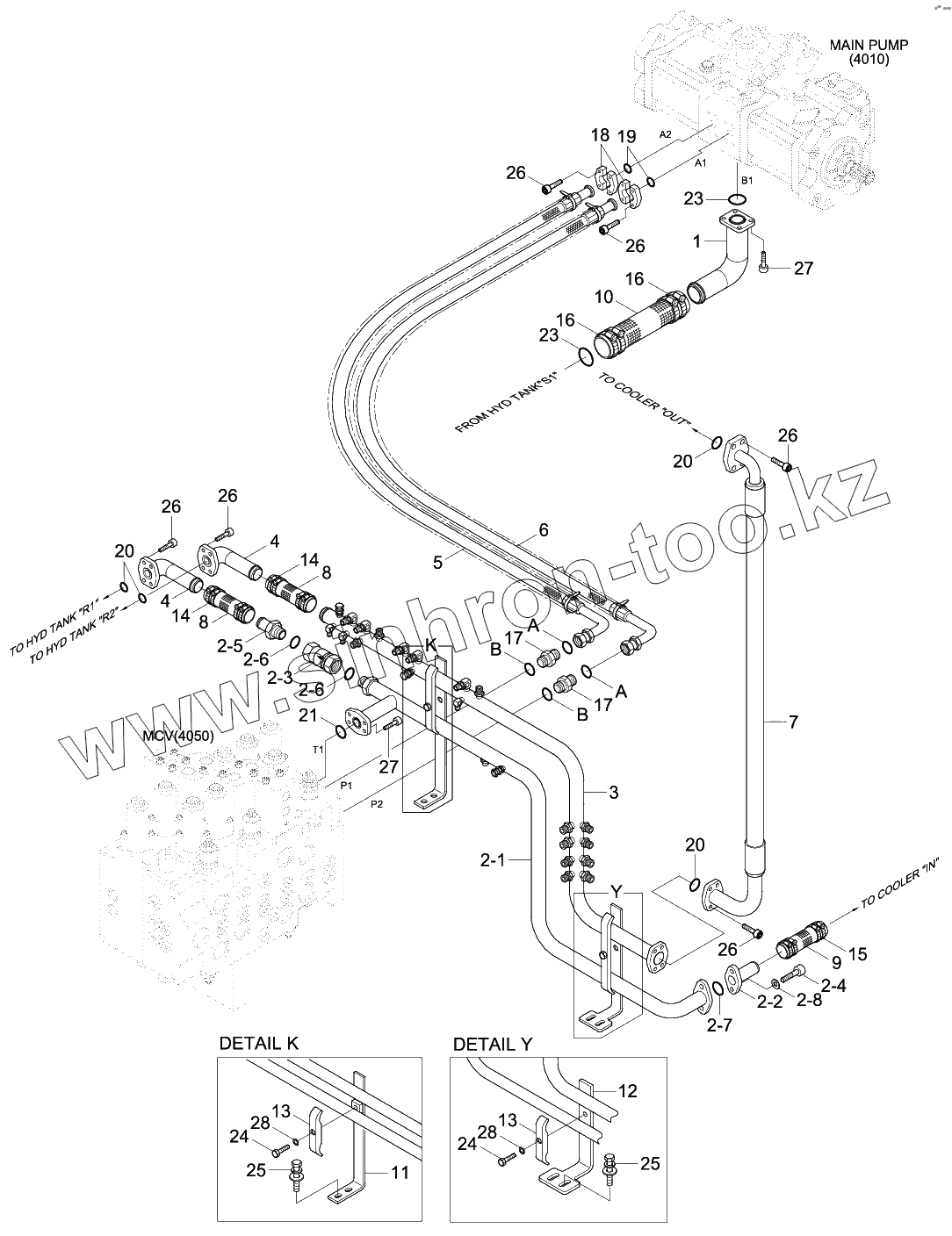 Каталог запасных частей к технике: Hyundai R140W-9. UPPER HYD PIPING (BASE)
