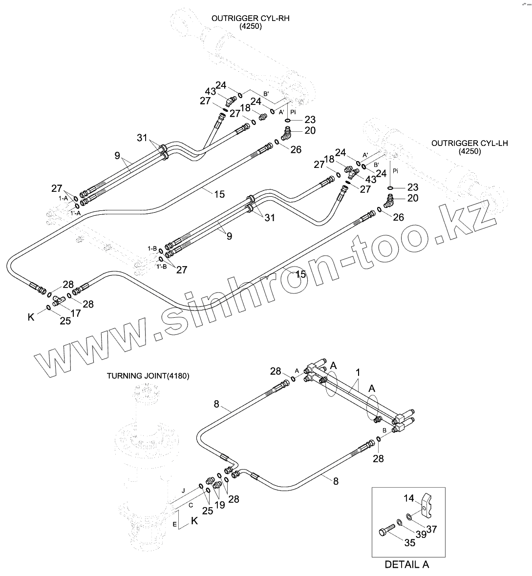 Каталог запасных частей к технике: Hyundai R140W-9S. LOWER HYD PIPING 1(4 OUTRIGGER, -#0014)