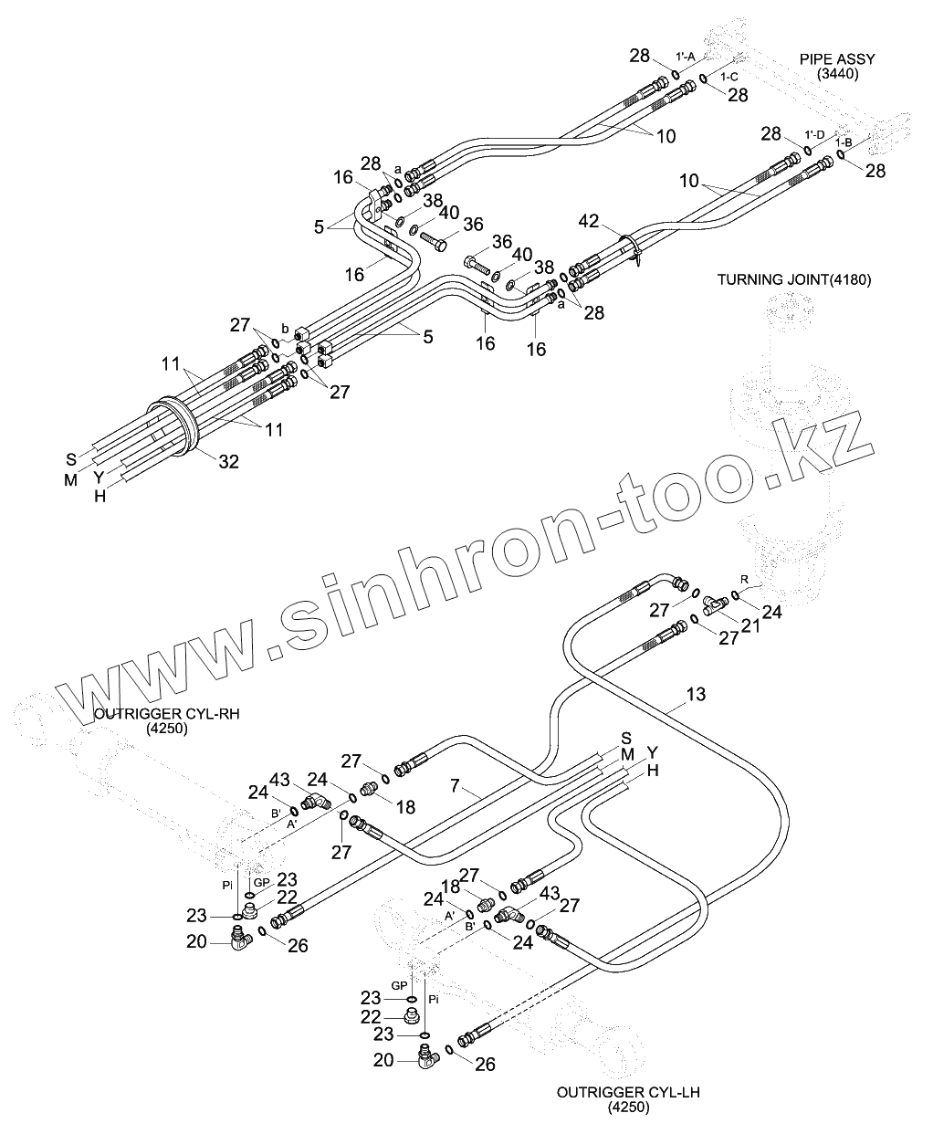 Каталог запасных частей к технике: Hyundai R140W-9S. LOWER HYD PIPING 2(4 OUTRIGGER, -#0014)