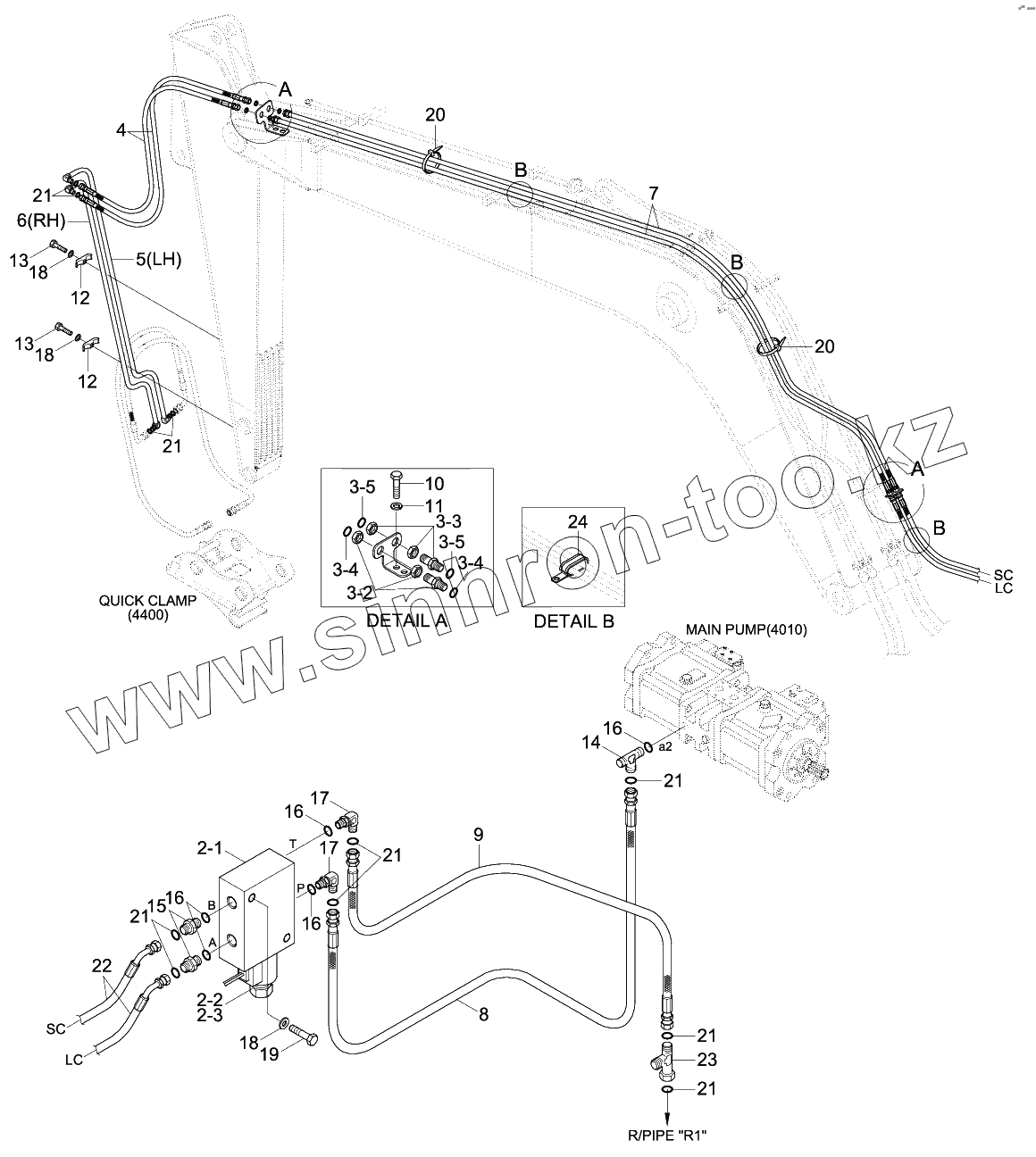 Каталог запасных частей к технике: Hyundai R170W-9. QUICK CLAMP HYD PIPING
