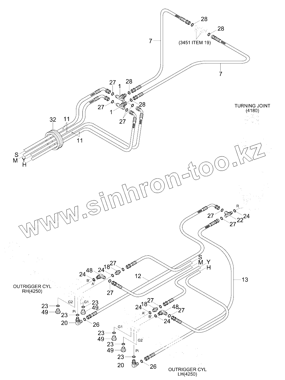 Каталог запасных частей к технике: Hyundai R170W-9S. LOWER HYD PIPING 2 (4-OUTRIGGER, #0067-)