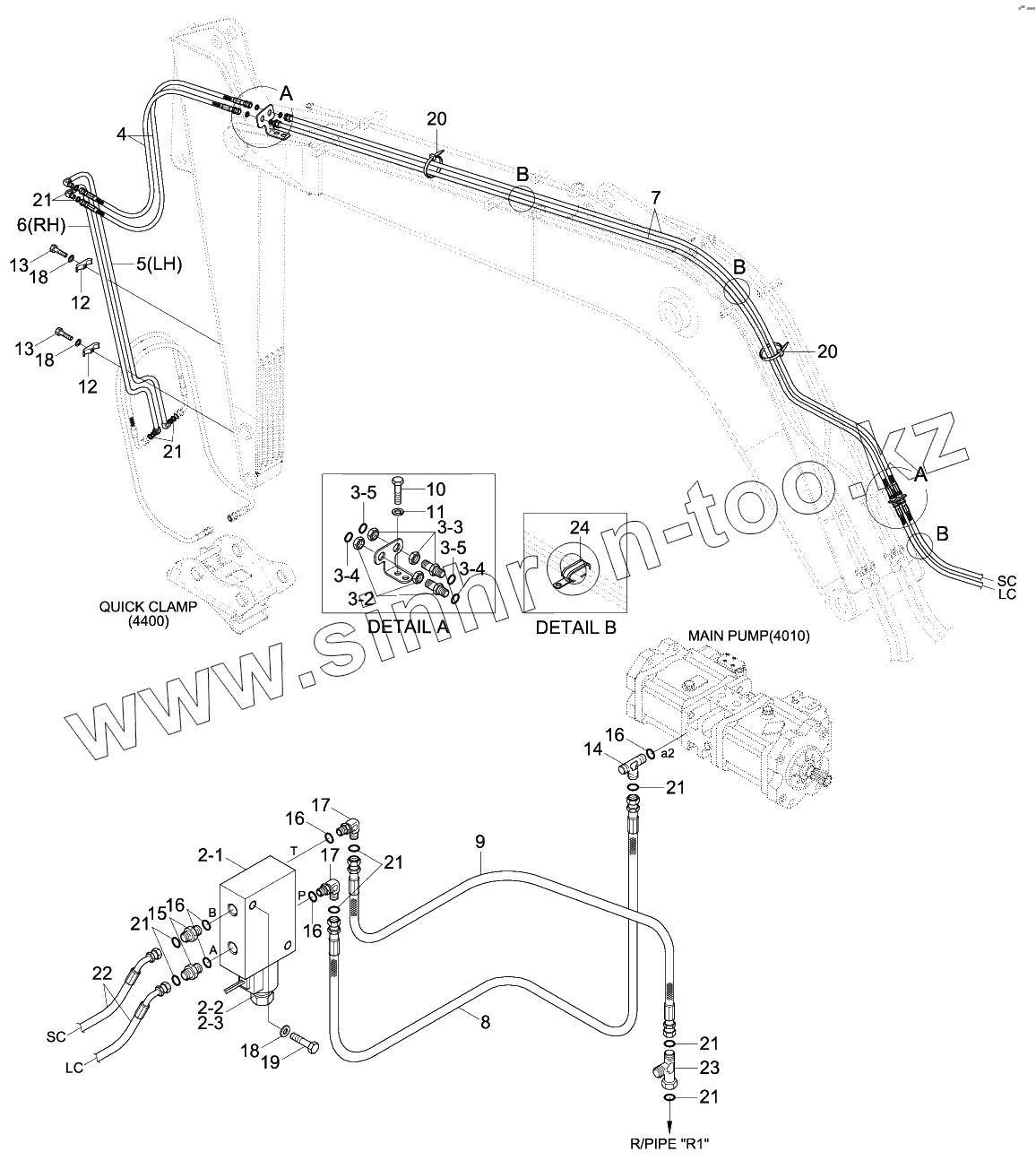 Каталог запасных частей к технике: Hyundai R180LC-9. QUICK CLAMP HYD PIPING