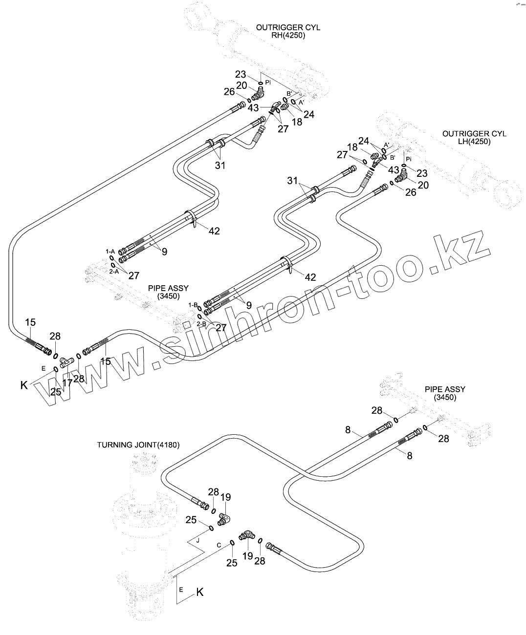Каталог запасных частей к технике: Hyundai R180W-9S. LOWER HYD PIPING 2 (4-OUTRIGGER, -#0066)