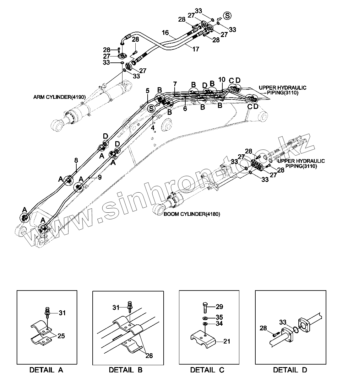 Каталог запасных частей к технике: Hyundai R330LC-9A. BOOM HYDRAULIC PIPING (6.15M)