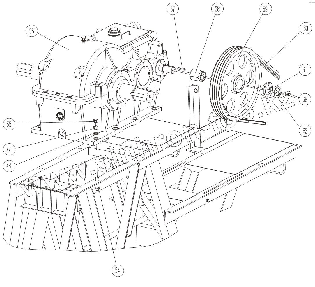 Каталог запасных частей к технике: Ижнефтемаш ПНШ-60-2,1-25. Крепление редуктора и шкива