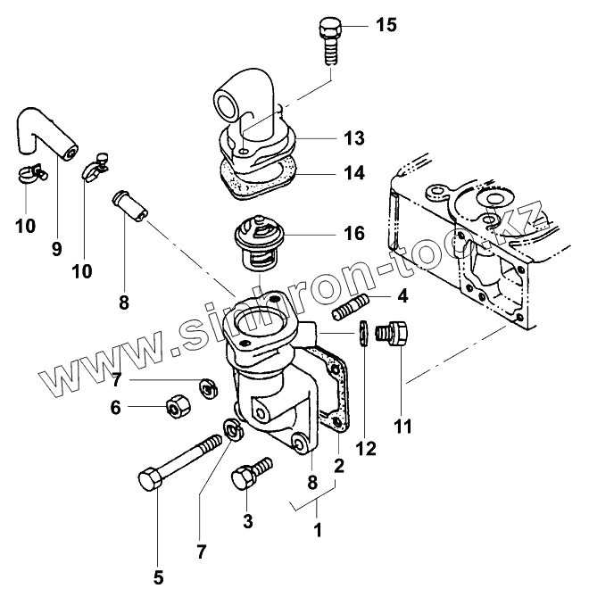 Каталог запасных частей к технике: JCB VMТ-270/280. Термостат/Water flange and thermostat