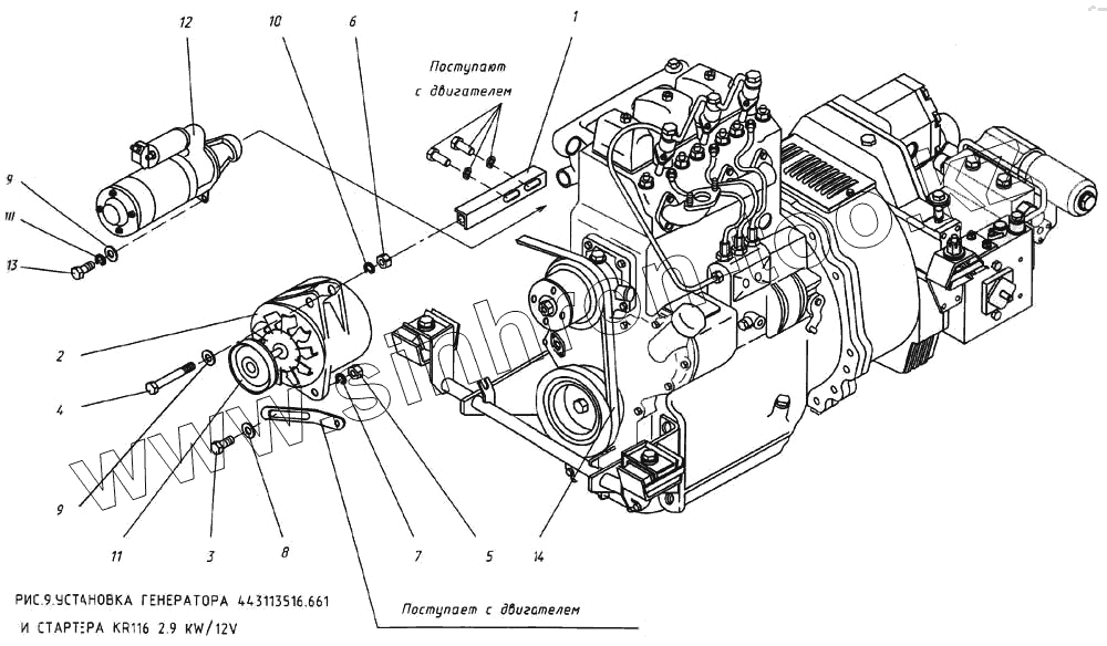 Каталог запасных частей к технике: КМЗ МКСМ-800. Установка генератора и стартера