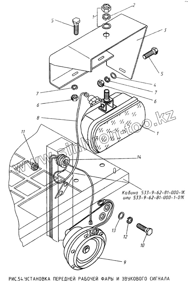 Каталог запасных частей к технике: КМЗ МКСМ-800. Установка передней рабочей фары и звукового сигнала