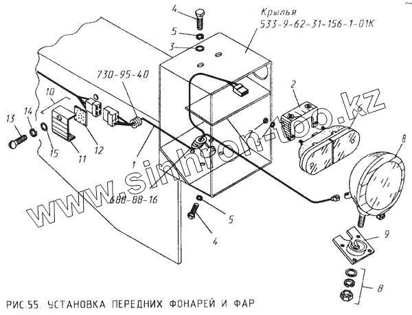 Каталог запасных частей к технике: КМЗ МКСМ-800. Установка передних фонарей и фар