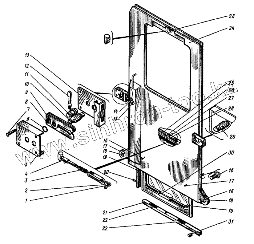Каталог запасных частей к технике: КМЗ 1 Мая КДЭ-163. Дверь кабины боковая. (23-22030)