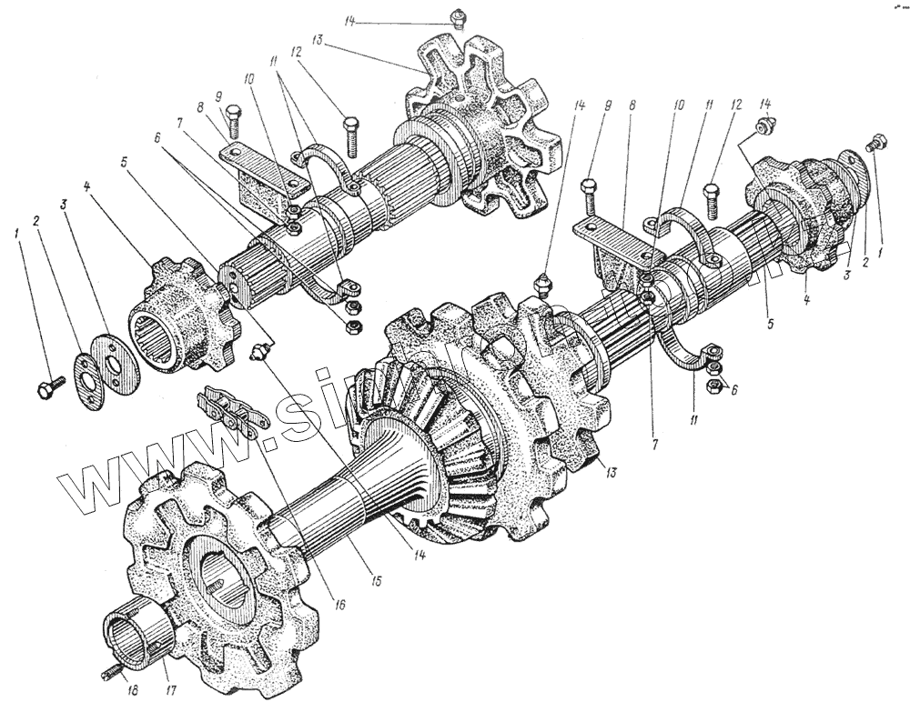 Каталог запасных частей к технике: Ковровец Э-652Б. 652.075 Вал горизонтальный в сборе