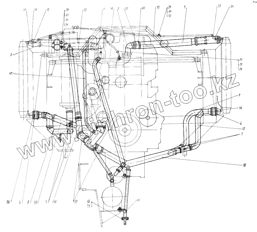 Каталог запасных частей к технике: КЗКТ-74281. Монтаж трубопроводов системы охлаждения 7428-1303005-50