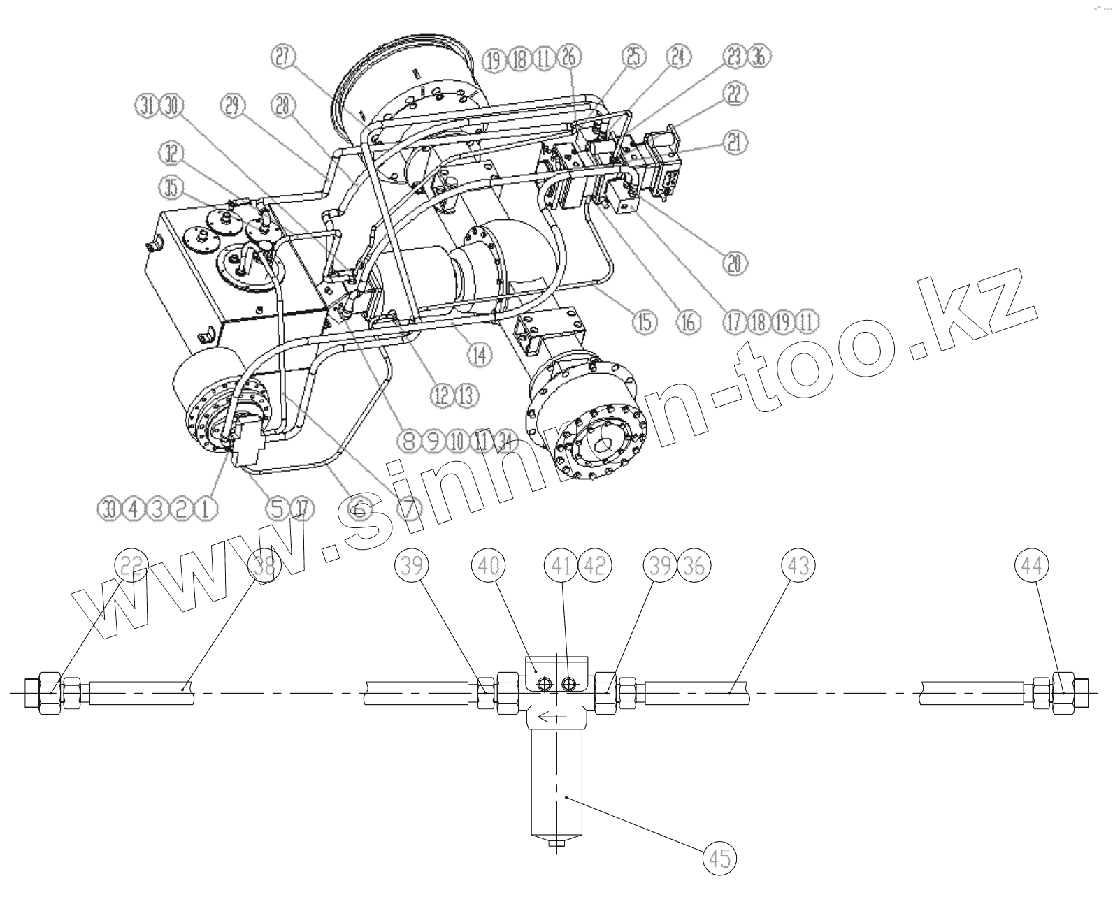 | 23 | 20491-26/20411-26x1W12x2200+RC | Hose from travel port T to drive motor port T | |