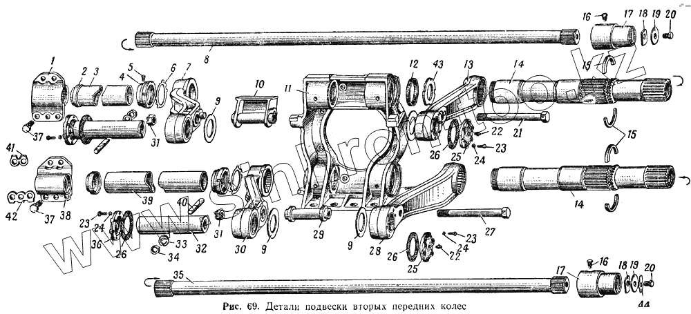 Каталог запасных частей к технике: МАЗ-537. Детали подвески вторых передних колес