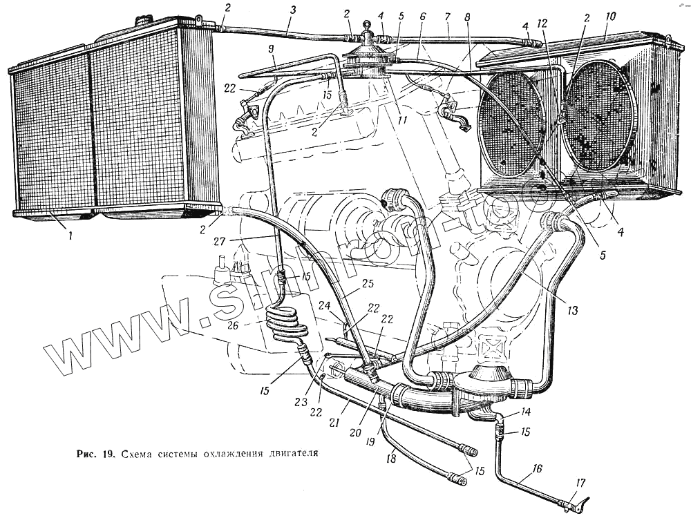 Каталог запасных частей к технике: МАЗ-537. Схема системы охлаждения двигателя