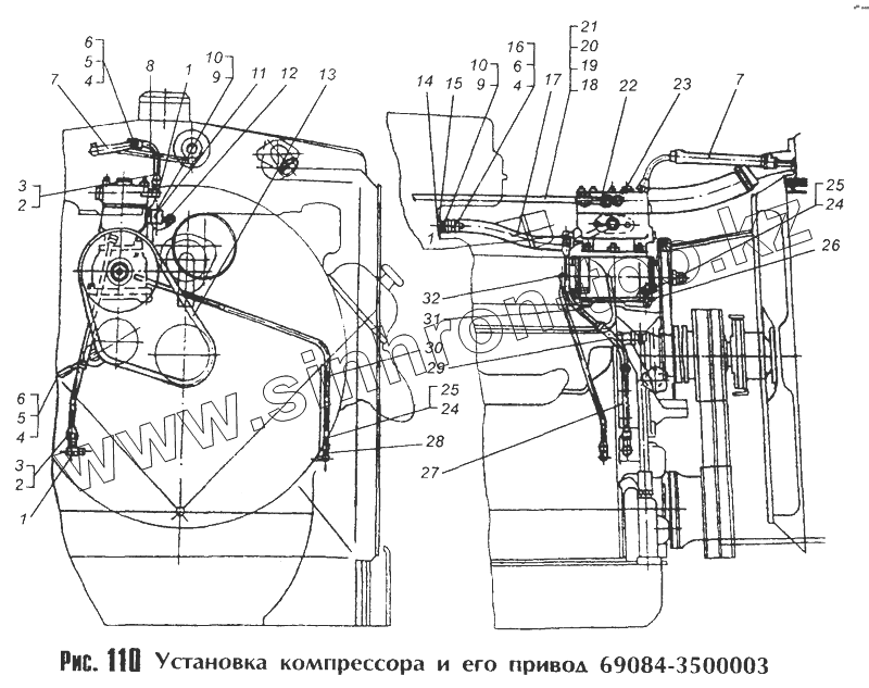 Каталог запасных частей к технике: МоАЗ 40481. Установка компрессора и его привод 69084-3500003