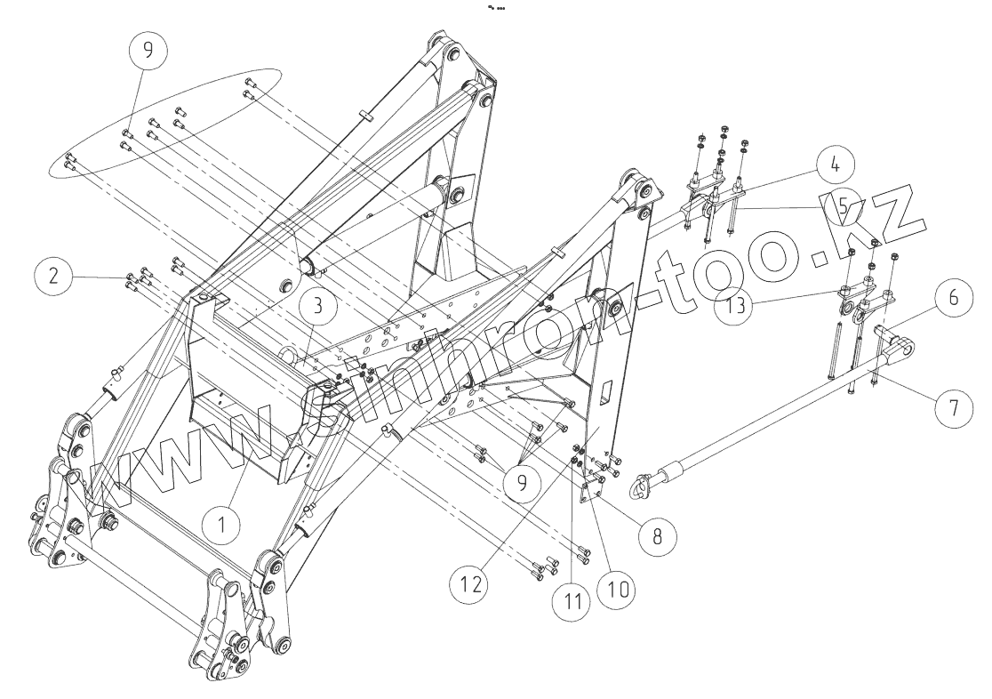 Каталог запасных частей к технике: Мозырский МЗ ПФС-0,75. Присоединение к раме трактора