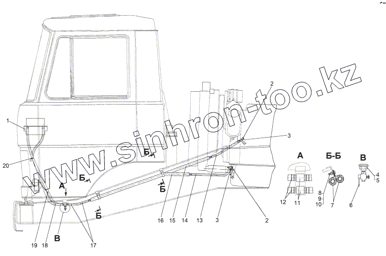 Каталог запасных частей к технике: МЗКТ-8006. Установка трубопроводов отопителя