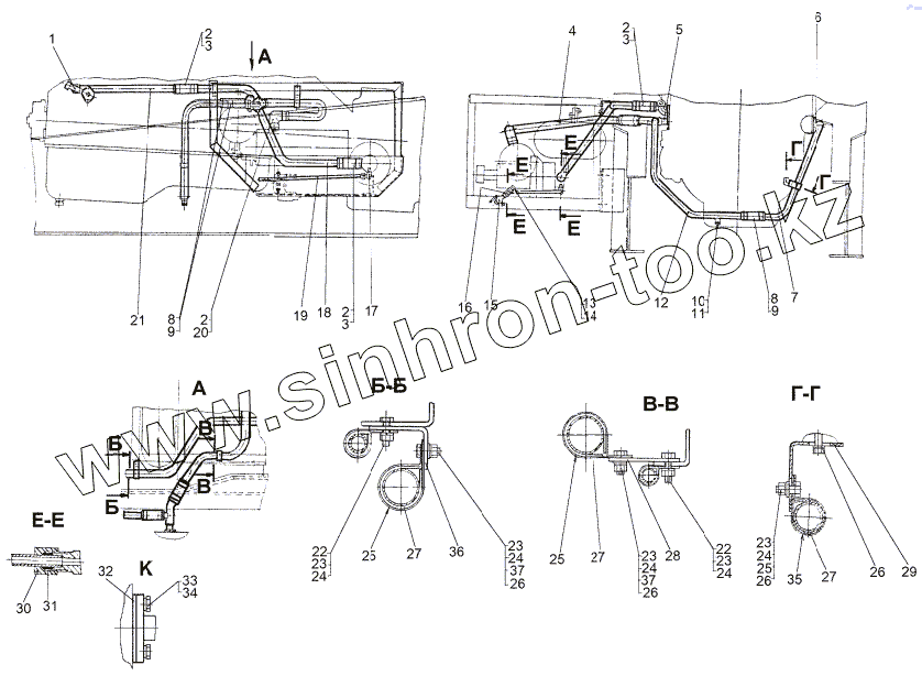Каталог запасных частей к технике: МЗКТ-8006. Установка трубопроводов системы подогрева двигателя