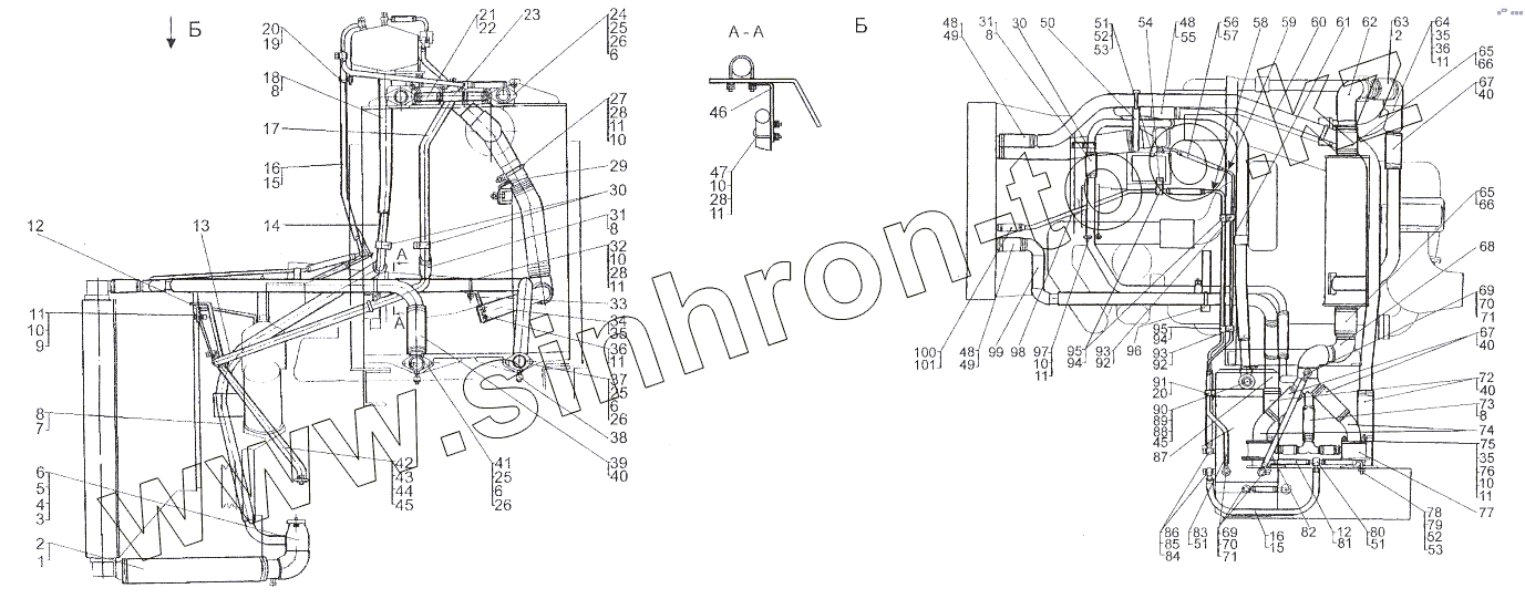 Каталог запасных частей к технике: МЗКТ-80211. Установка трубопроводов системы охлаждения