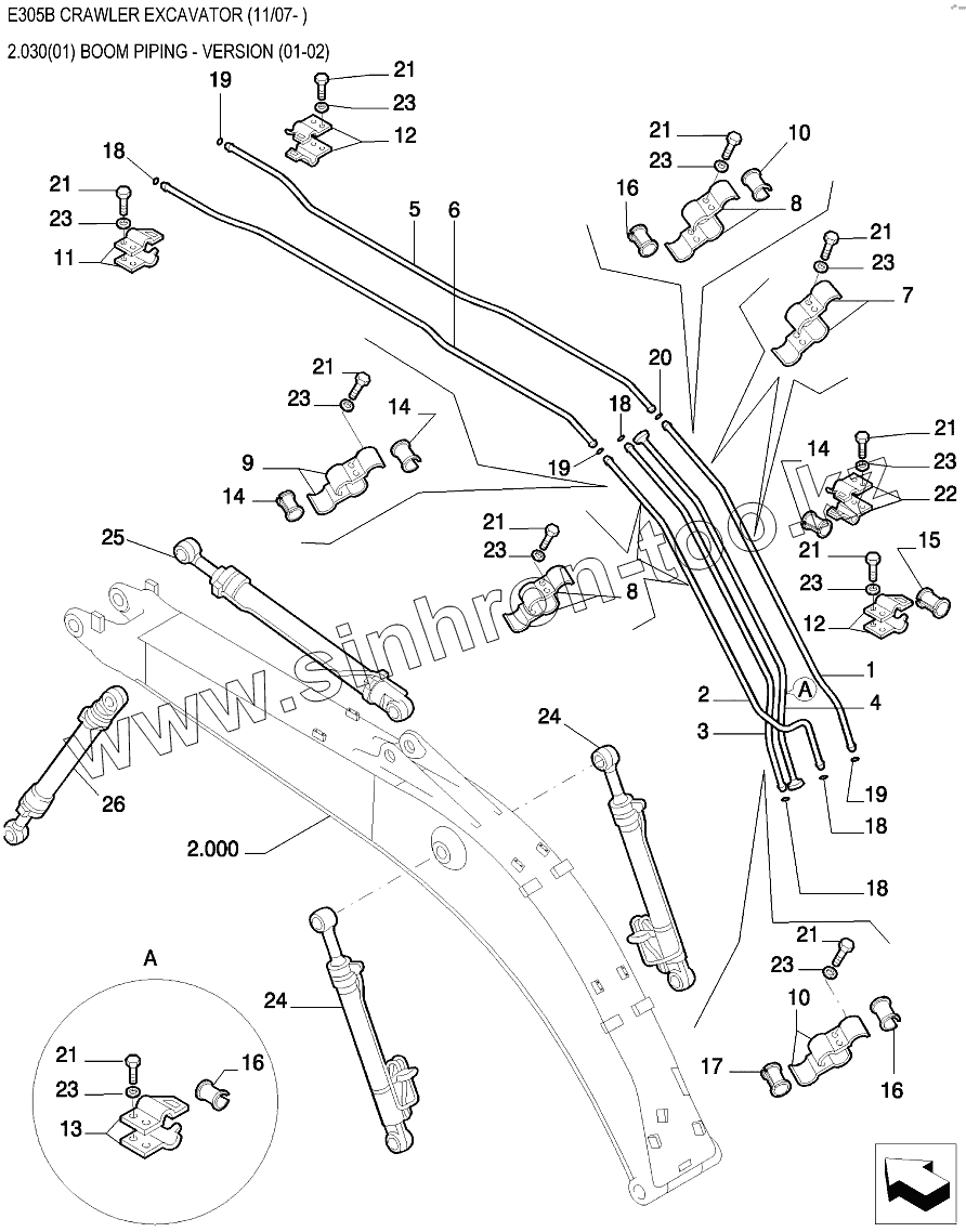 Каталог запасных частей к технике: New Holland Экскаватор E305B. Трубопроводы стрелы