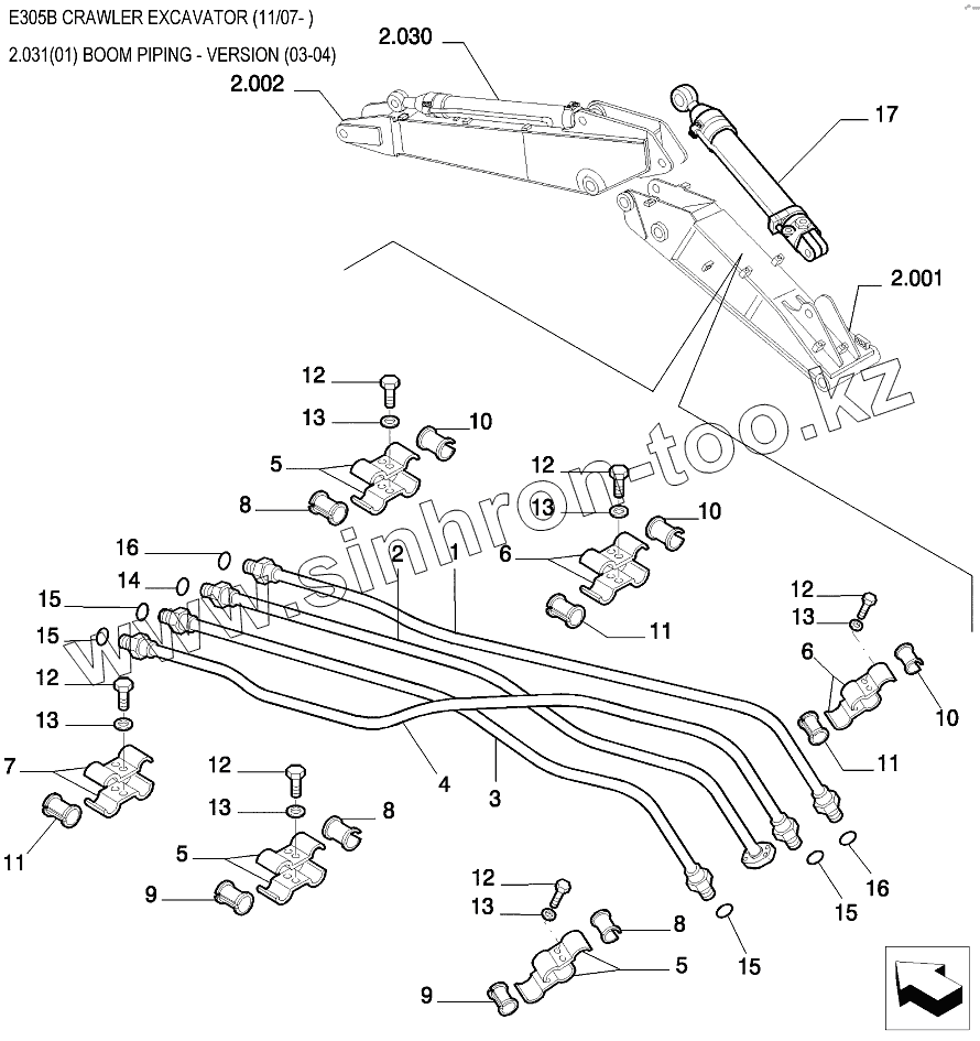 Каталог запасных частей к технике: New Holland Экскаватор E305B. Трубопроводы стрелы