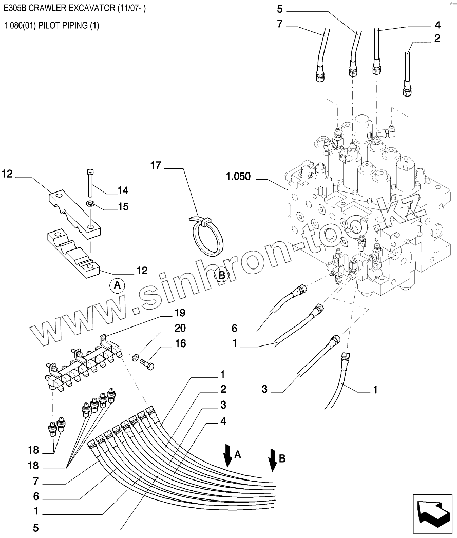Каталог запасных частей к технике: New Holland Экскаватор E305B. Трубопроводы управления