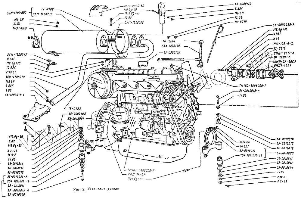 Каталог запасных частей к технике: Онежец ТДТ-55А. Установка дизеля