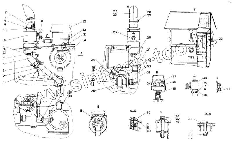 Каталог запасных частей к технике: Промтрактор Т-20.01Я. Установка систем воздухоочистки и выпуска