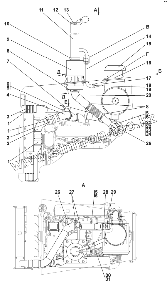 Каталог запасных частей к технике: Промтрактор Т-20.02Я (Четра). Установка систем воздухоочистки и выпуска