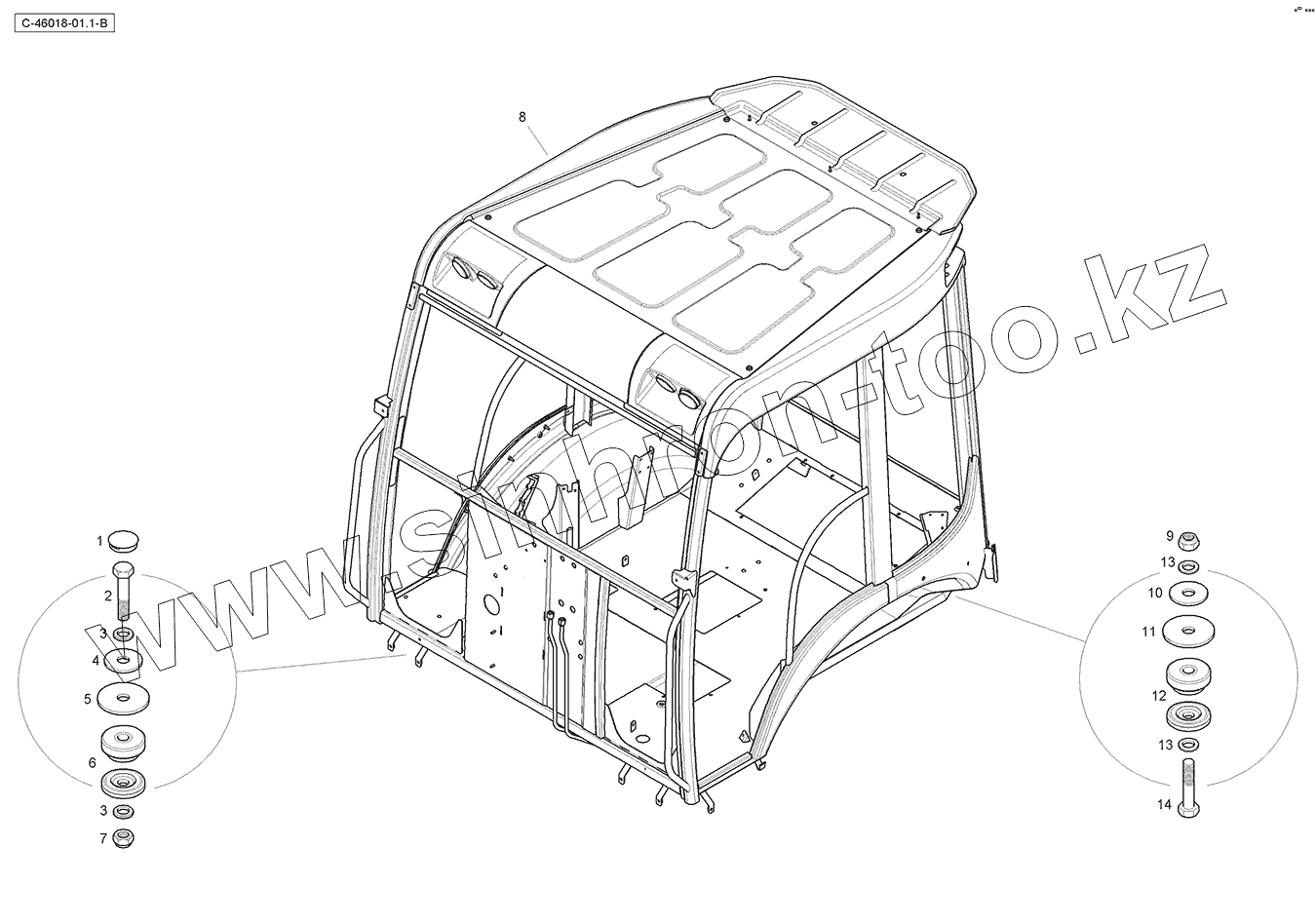 Каталог запасных частей к технике: RM-Terex TLB-990 Tier 3. Cab - without windscreen - Structure - Mounts