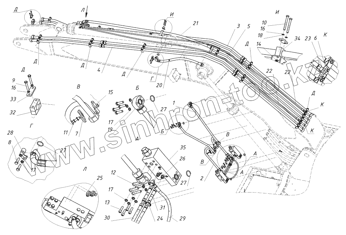 Каталог запасных частей к технике: ТВЭКС TX220NLC. Гидроразводка стрелы с тормозными клапанами