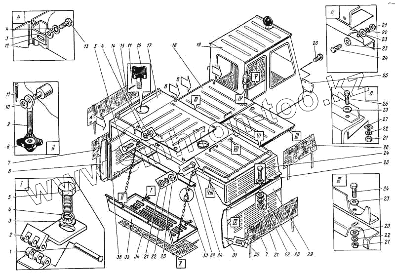 Каталог запасных частей к технике: ВЭКС ЭО-5122. Установка капотов и кабины