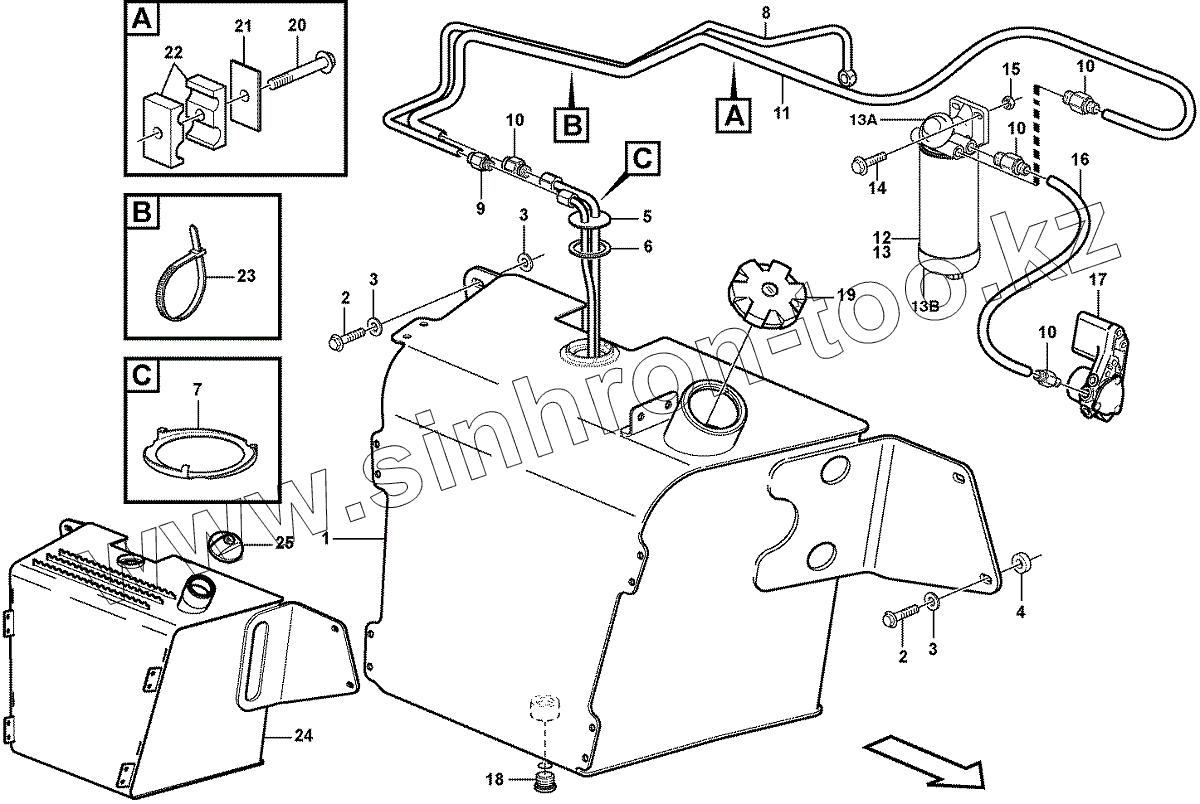 Каталог запасных частей к технике: Volvo BL71. 11883246, 11885148, 11887322 Fuel tank, fuel pipes